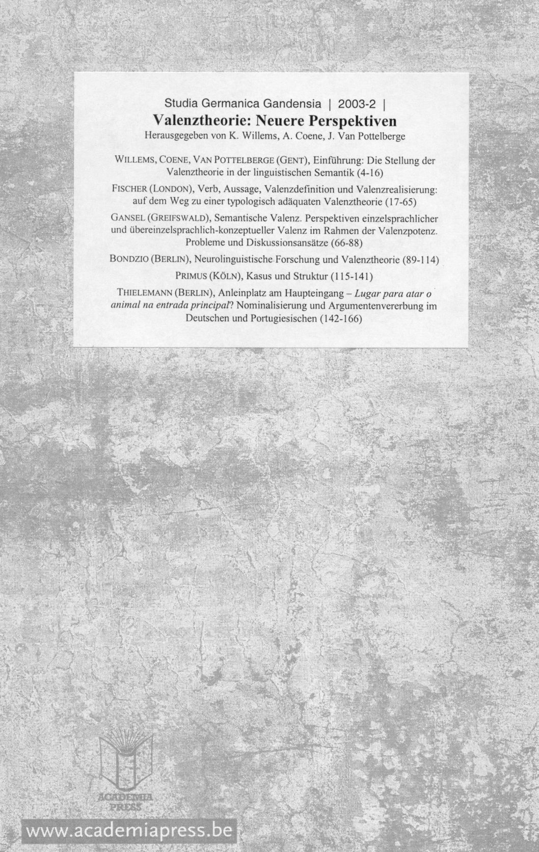 - with Ann Coene and Jeroen Van Pottelberge: Valenztheorie: Neuere Perspektiven. Studia Germanica Gandensia, 2003, Issue 2. Ghent: Academia Press. Contributions by: K. Willems/ A. Coene/J. Van Pottelberge (Ghent), K. Fischer (London), C. Gansel (Greifswald), W. Bondzio (Berlin), W. Thielemann (Berlin). Index.