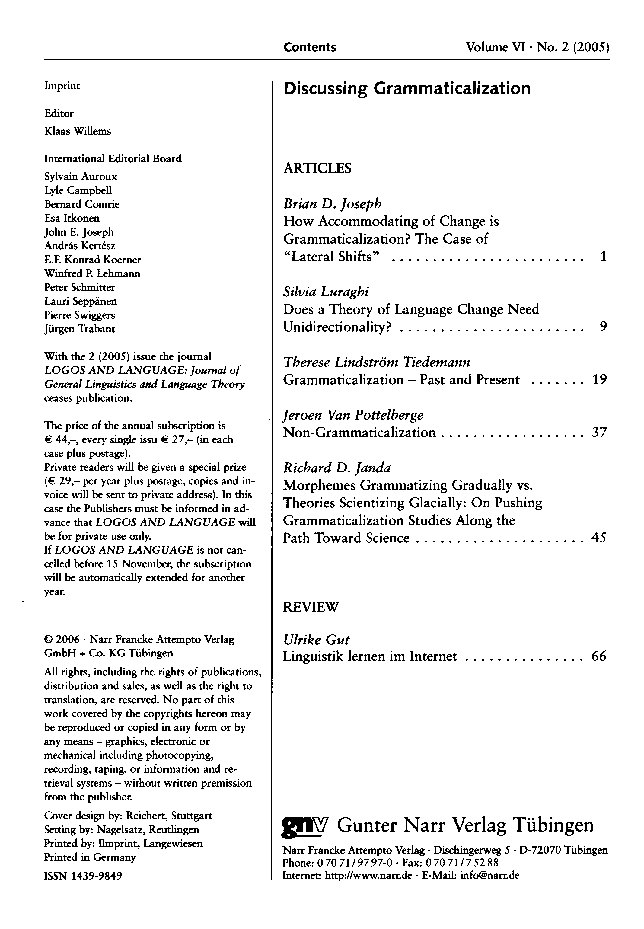 - Discussing Grammaticalization, Vol. VI: 2 of Logos and Language. Journal of General Linguistics and Language Theory, Tübingen: Gunter Narr Verlag (2005), contributions by Brian D. Joseph (Ohio), Silvia Luraghi (Rome), Therese Lindström Tiedemann (Sheffield), Jeroen van Pottelberge (Ghent), Richard D. Janda (Bloomington), U. Gut (Freiburg i.B.).