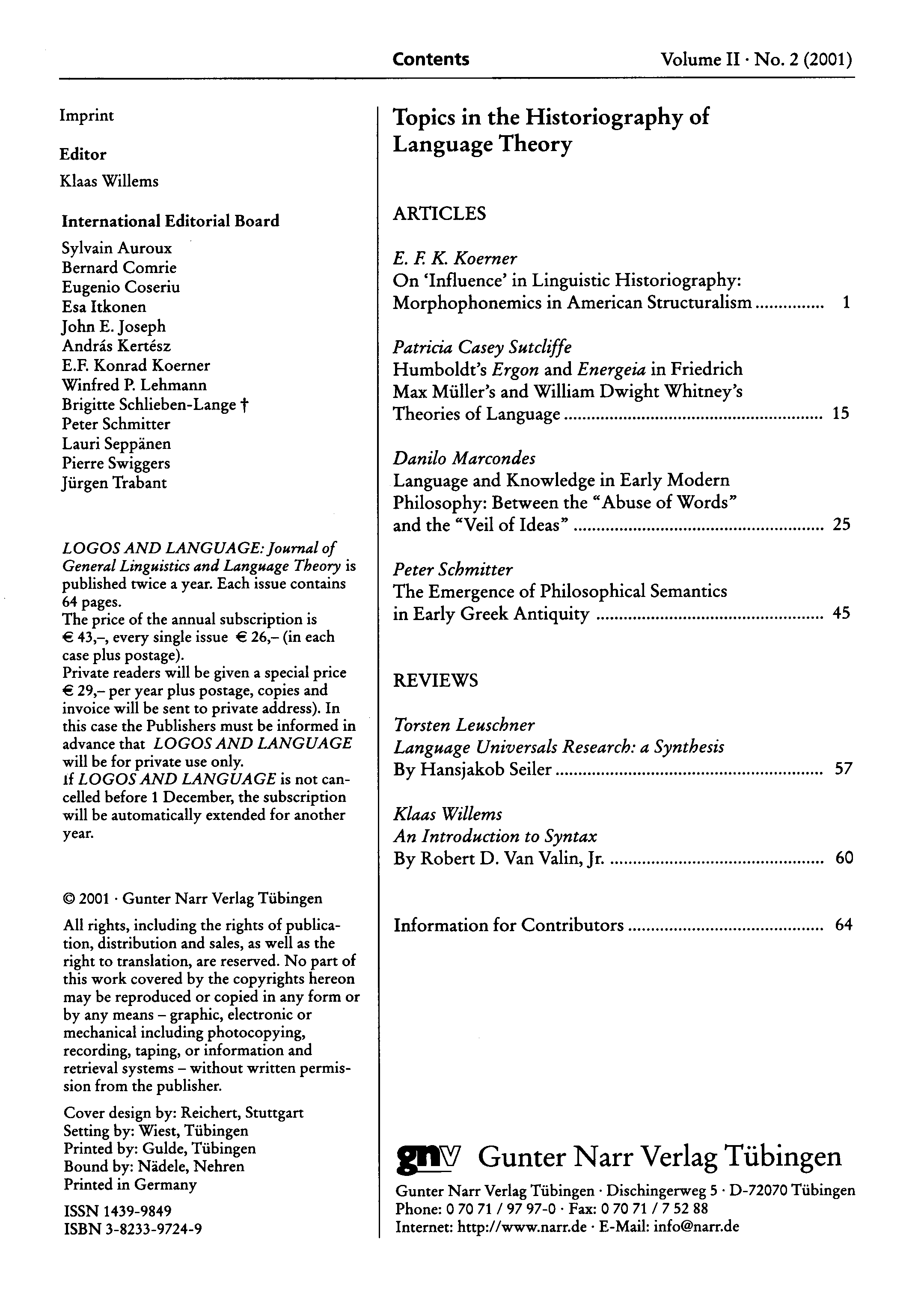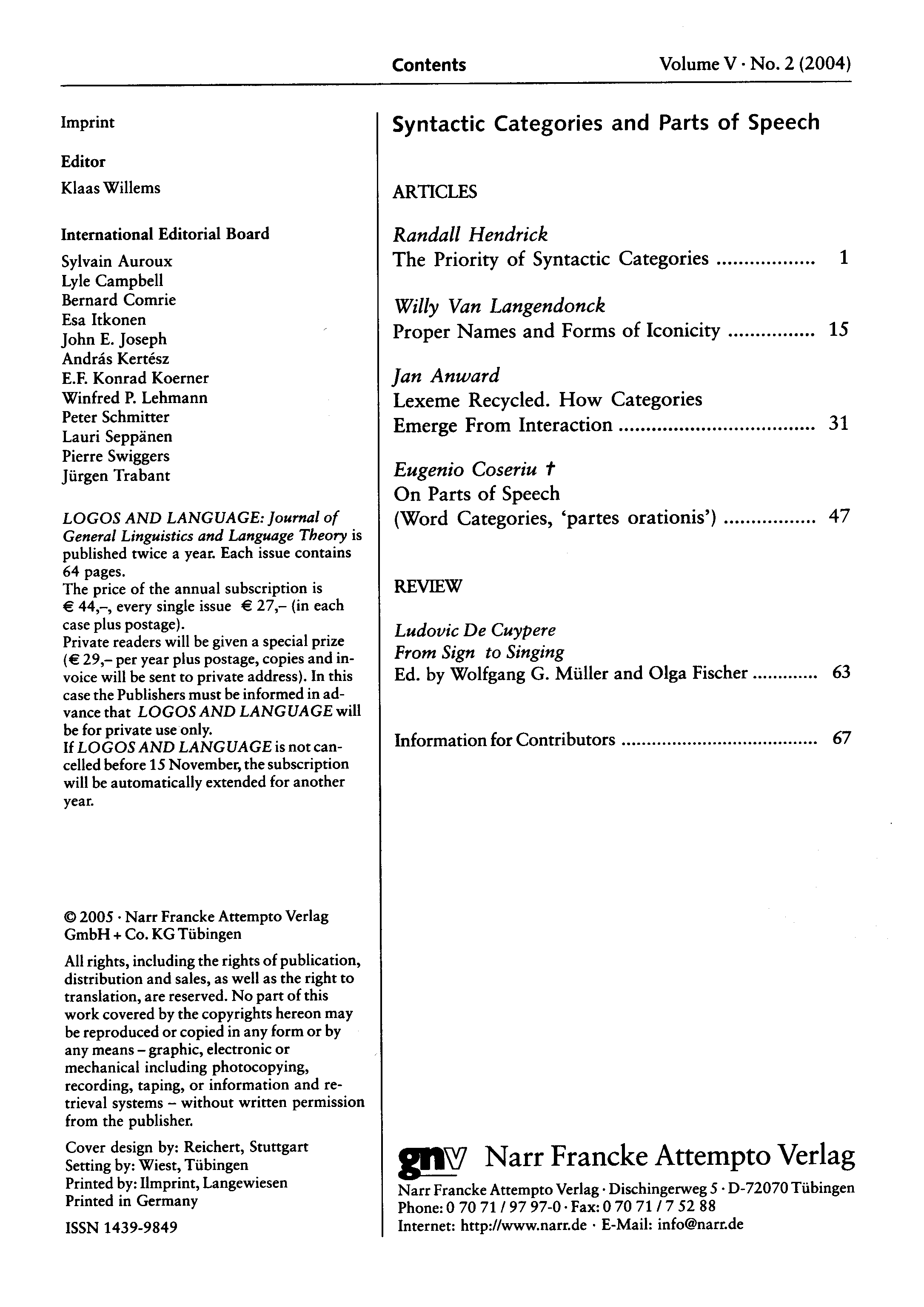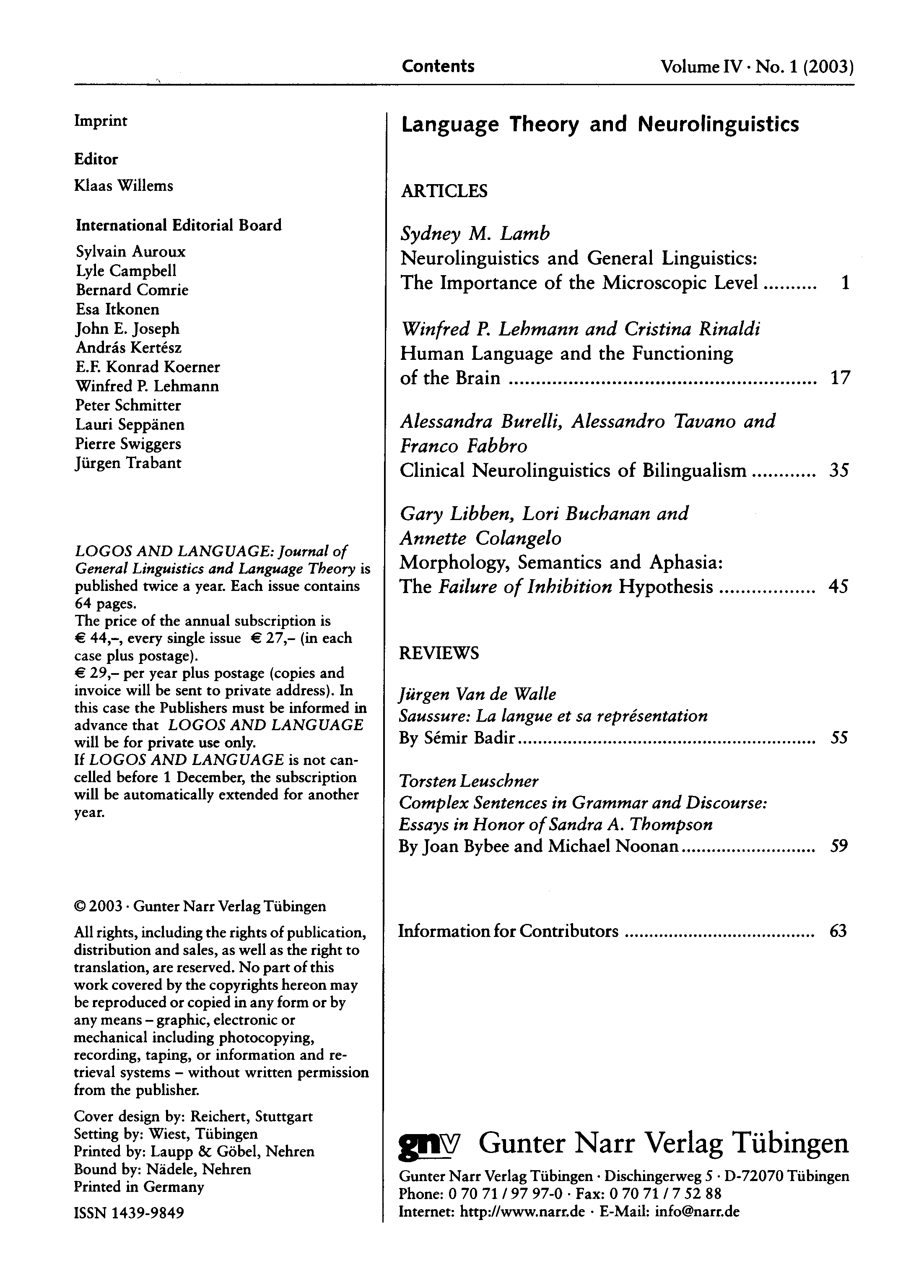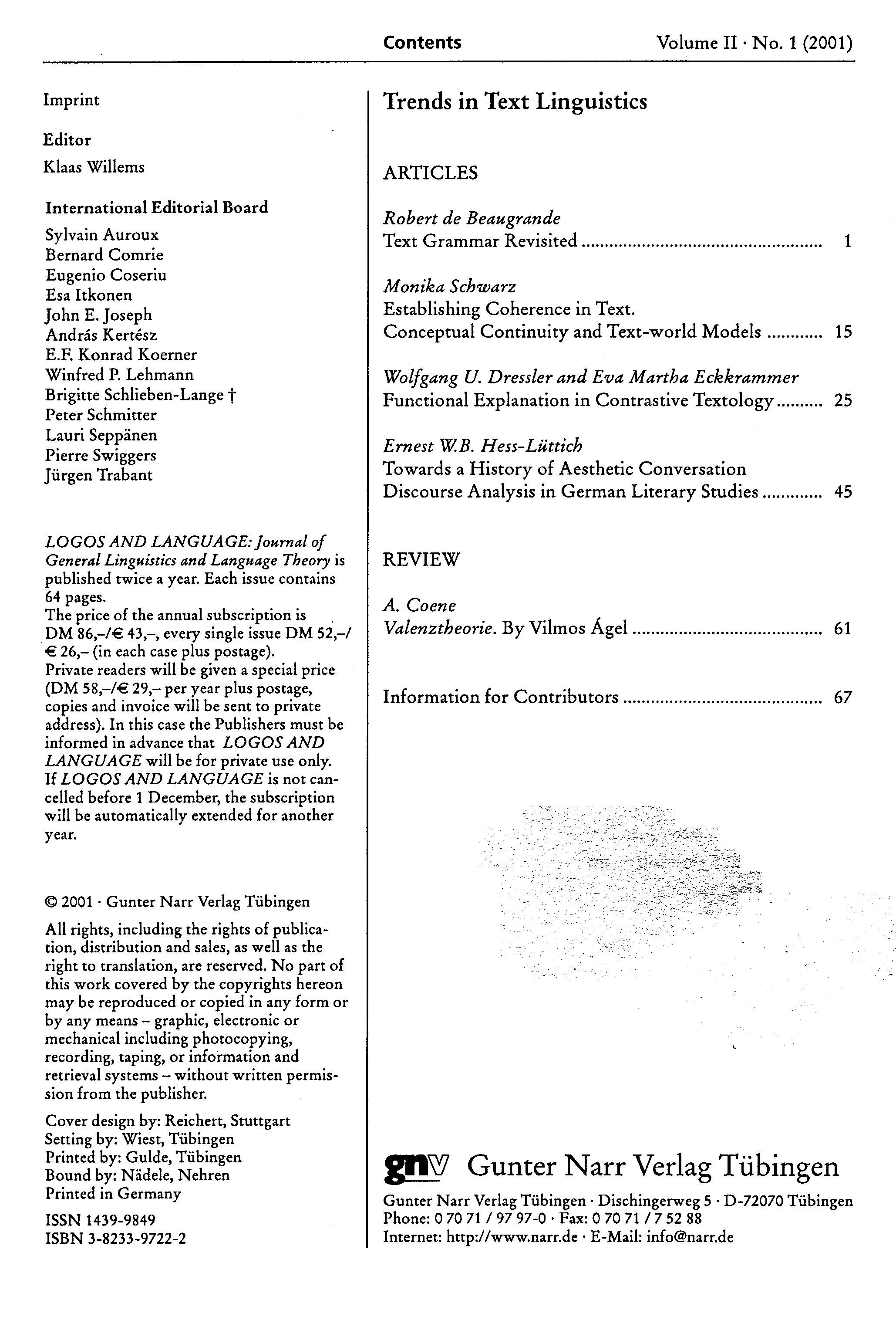 General link: http://int.narr.de/→ Journals → Logos and Language