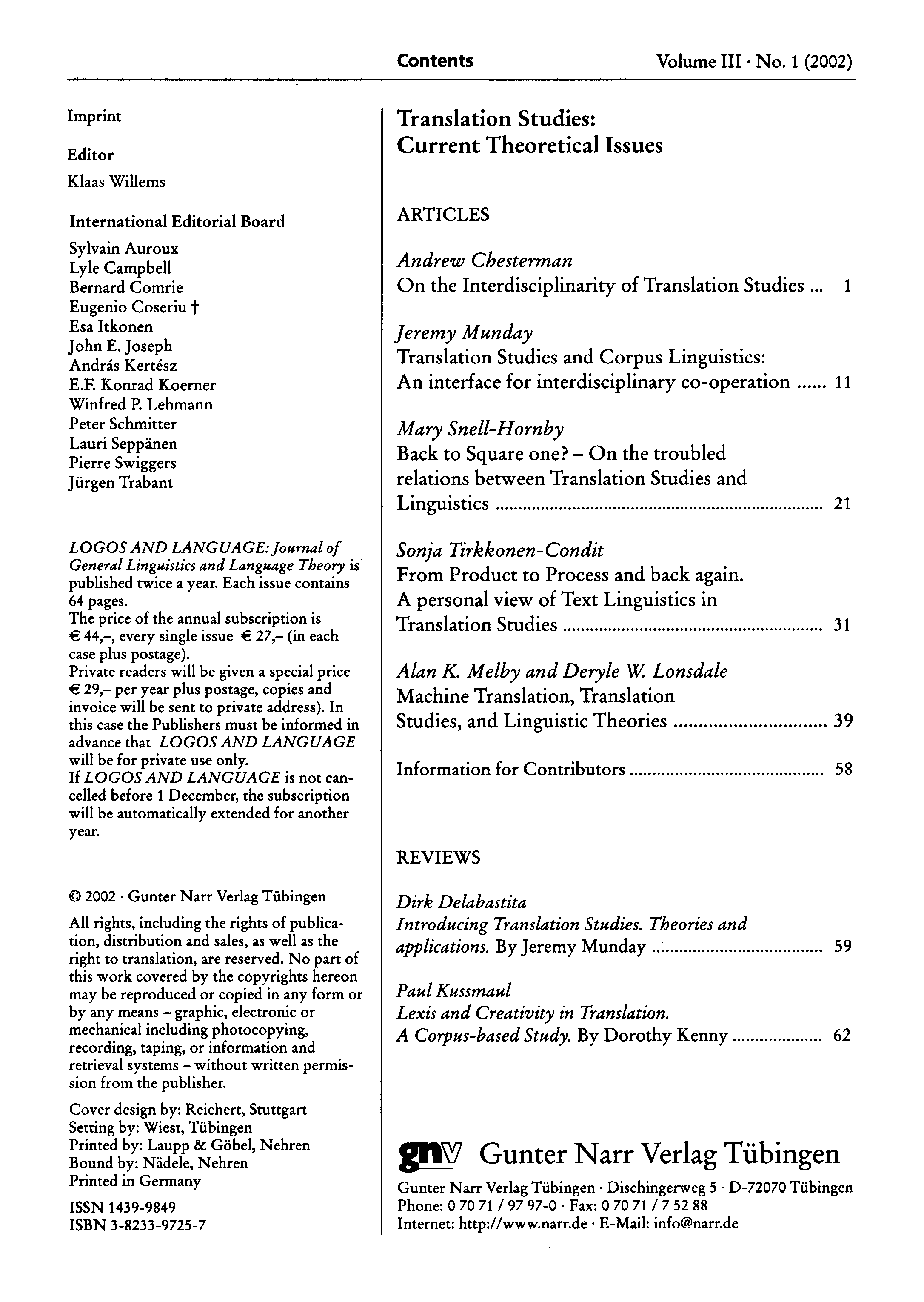 - Translation Studies: Current Theoretical Issues: Current Theoretical Issues, Vol. III: 1 of Logos and Language. Journal of General Linguistics and Language Theory, Tübingen: Gunter Narr Verlag (2002), contributions by: A. Chestermann (Helsinki), M. Snell-Hornby (Vienna), P. Tirkkonen-Condit (Savonlinna), J. Munday (Bradford), D. Delabastita (Luik), P. Kussmaul (Mainz), D. Katan (Udine and Trieste).