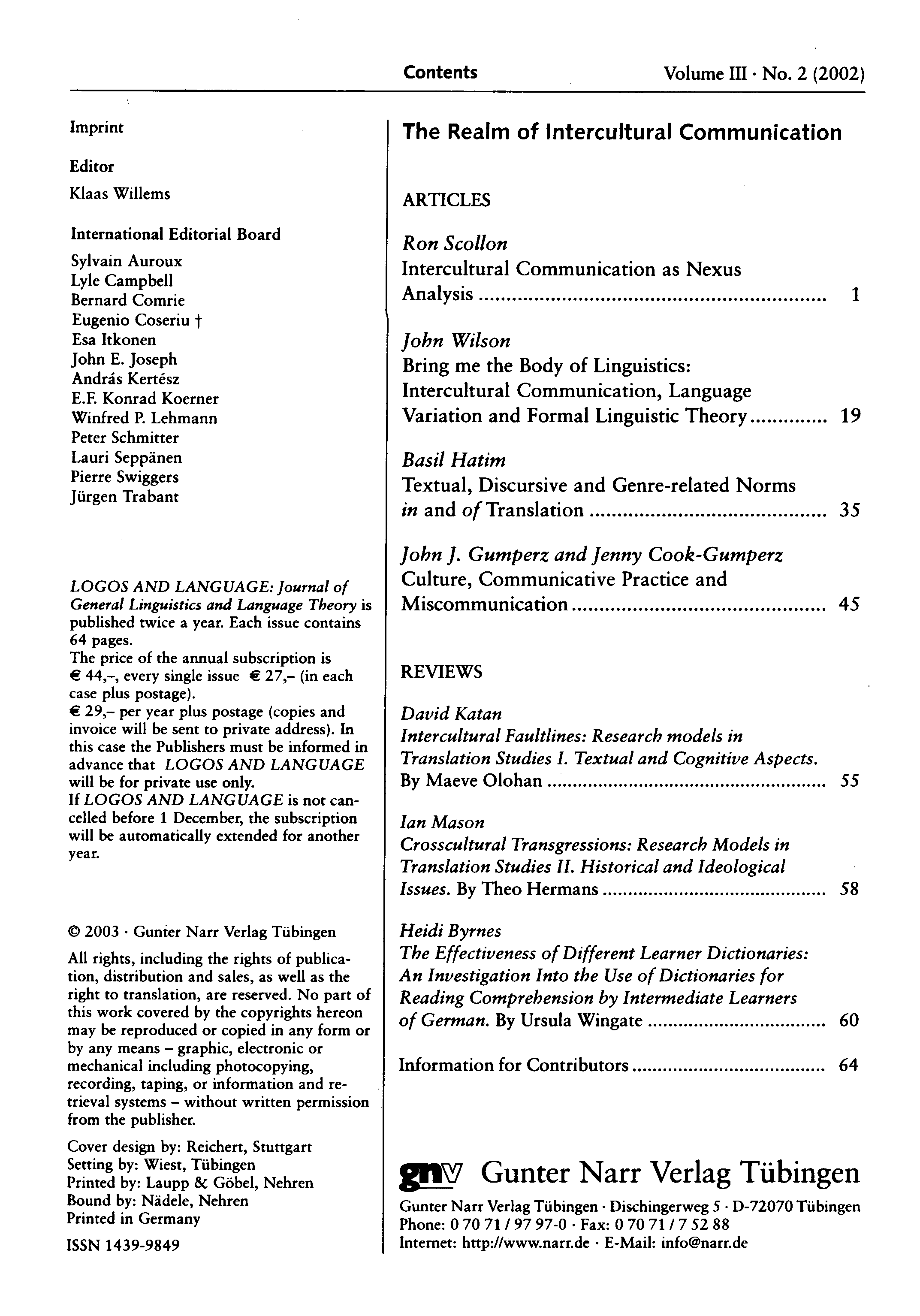 - The Realm of Intercultural Communication, Vol. III: 2 of Logos and Language. Journal of General Linguistics and Language Theory, Tübingen: Gunter Narr Verlag (2002), contributions by: R. Scollon (Washington), J. Wilson (Ulster), B. Hatim (Sharjah, UAE), J. Gumperz and J. Cook-Gumperz (Berkeley/Santa Barbara), D. Katan (Trieste), I. Mason (Edinburgh), H. Byrnes (Washington).