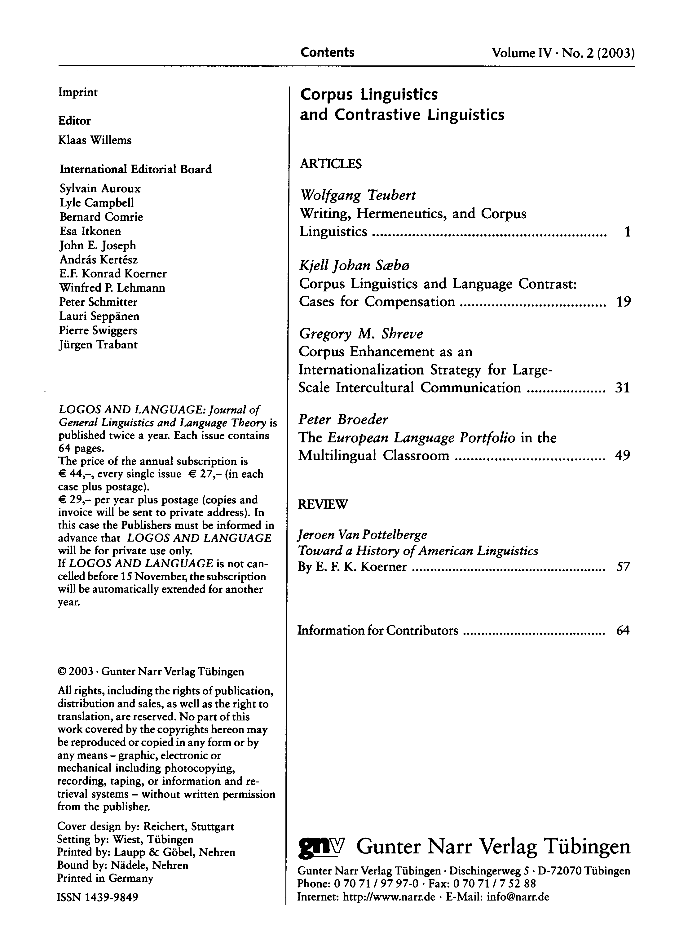 - Corpus Linguistics and Contrastive Linguistics, Vol. IV: 2 of Logos and Language. Journal of General Linguistics and Language Theory, Tübingen: Gunter Narr Verlag (2003), contributions by W. Teubert (Birmingham), K. J. Saebo (Oslo), G. M. Shreve (Kent, Ohio), P. Broeder (Utrecht), J. Van Pottelberge (Ghent).