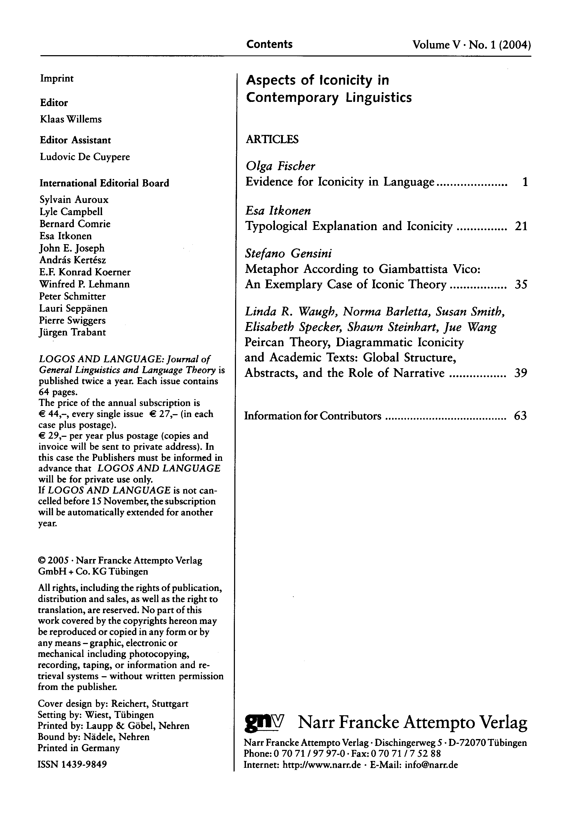 - Aspects of Iconicity in Contemporary Linguistics, Vol. V: 1 of Logos and Language. Journal of General Linguistics and Language Theory, Tübingen: Gunter Narr Verlag (2004), contributions by O. Fischer (Amsterdam), E. Itkonen (Turku), S. Gensini (Napels), L. Waugh et al. (Tucson, Arizona).