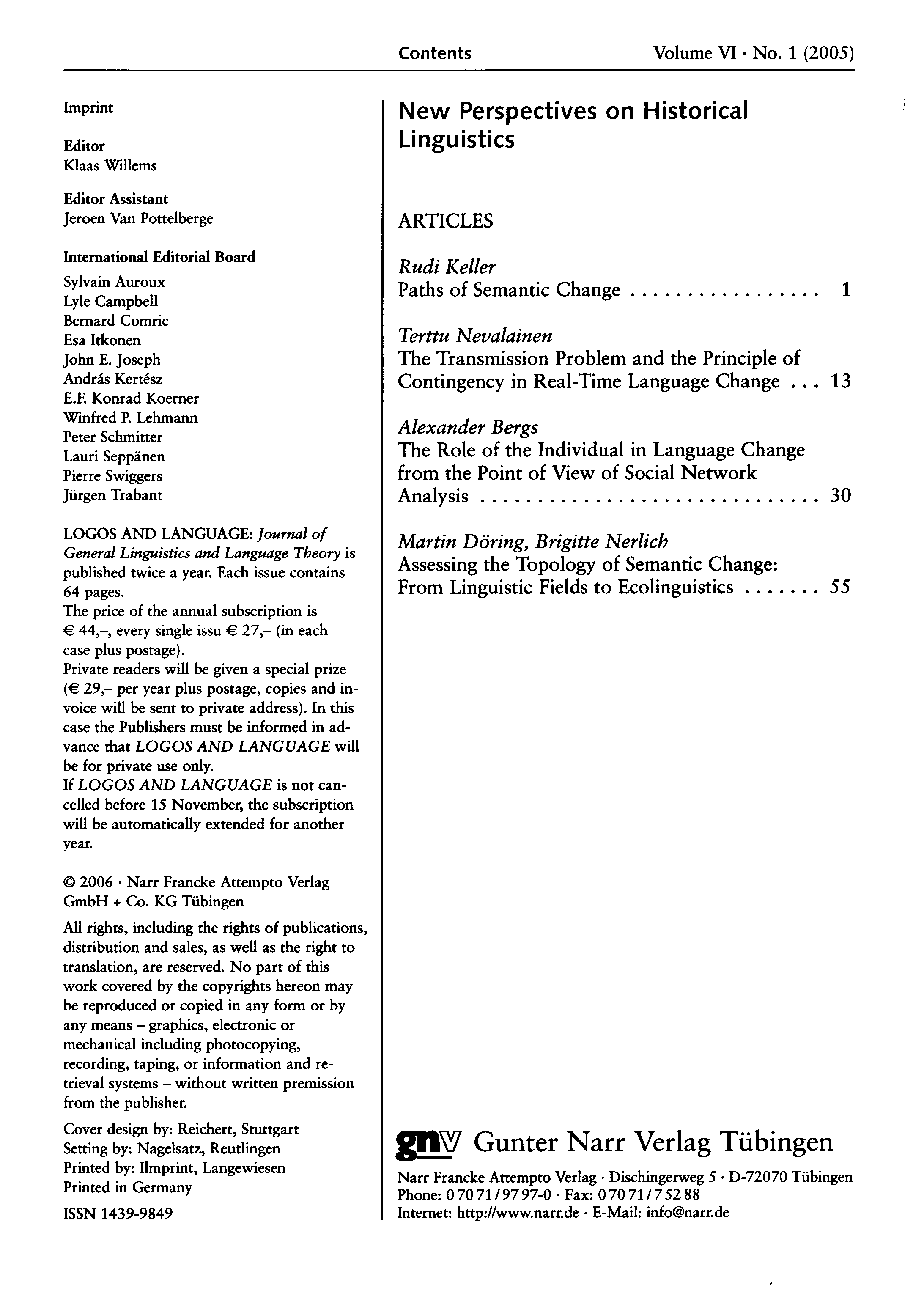 - New Perspectives on Historical Linguistics, Vol. VI: 1 of Logos and Language. Journal of General Linguistics and Language Theory, Tübingen: Gunter Narr Verlag (2005), contributions by R. Keller (Düsseldorf), T. Nevalainen (Helsinki), A. Bergs (Osnabrück), M. Döring and B. Nerlich (Geesthacht/Nottingham).
