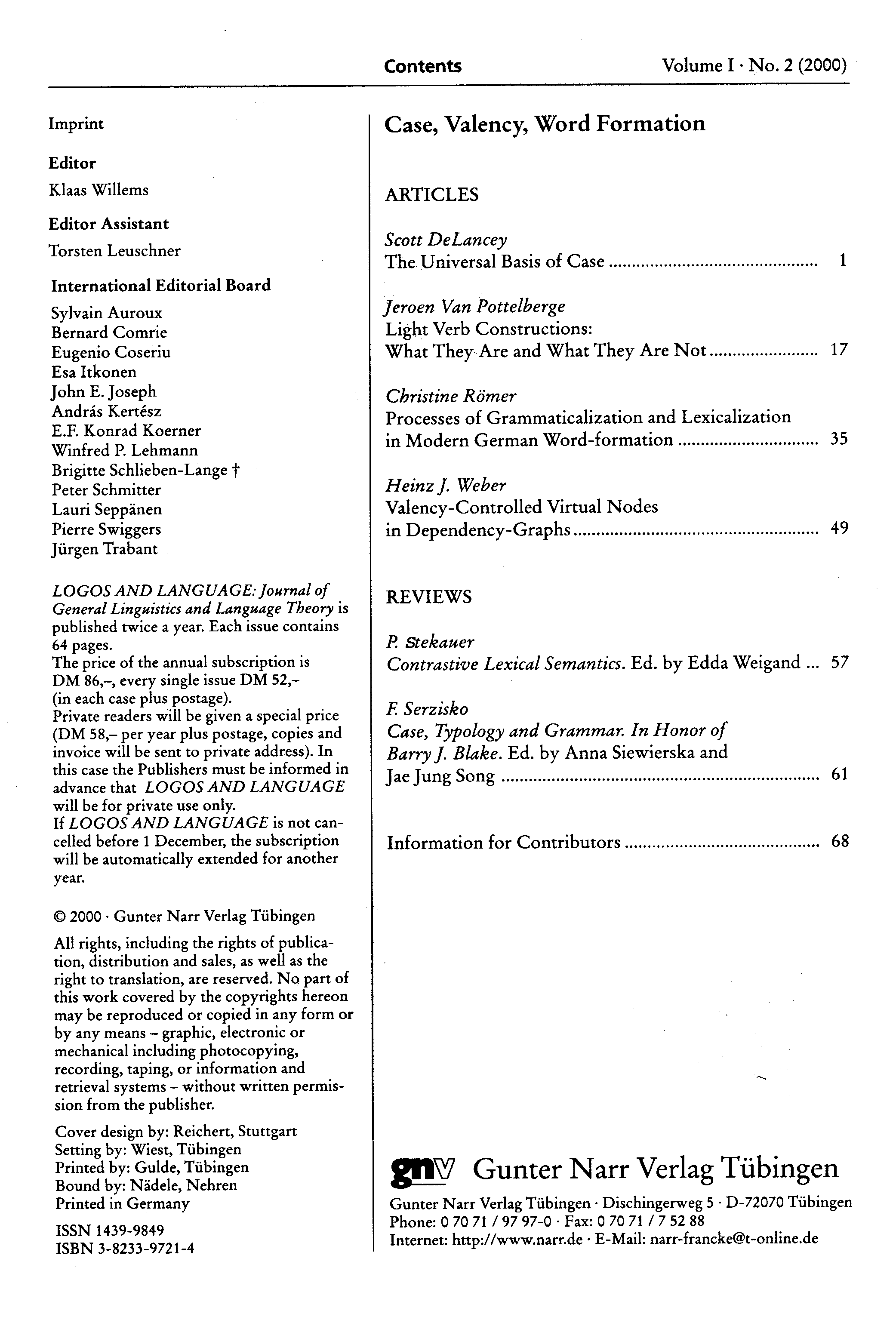 - Case, Valency, Word Formation, Vol. I: 2 of Logos and Language. Journal of General Linguistics and Language Theory, Tübingen: Gunter Narr Verlag (2000), contributions by: S. DeLancey (Oregon), J. Van Pottelberge (Ghent), Ch. Römer (Jena), H.J. Weber (Trier), P. Stekauer (Presov), F. Serzisko (Köln).